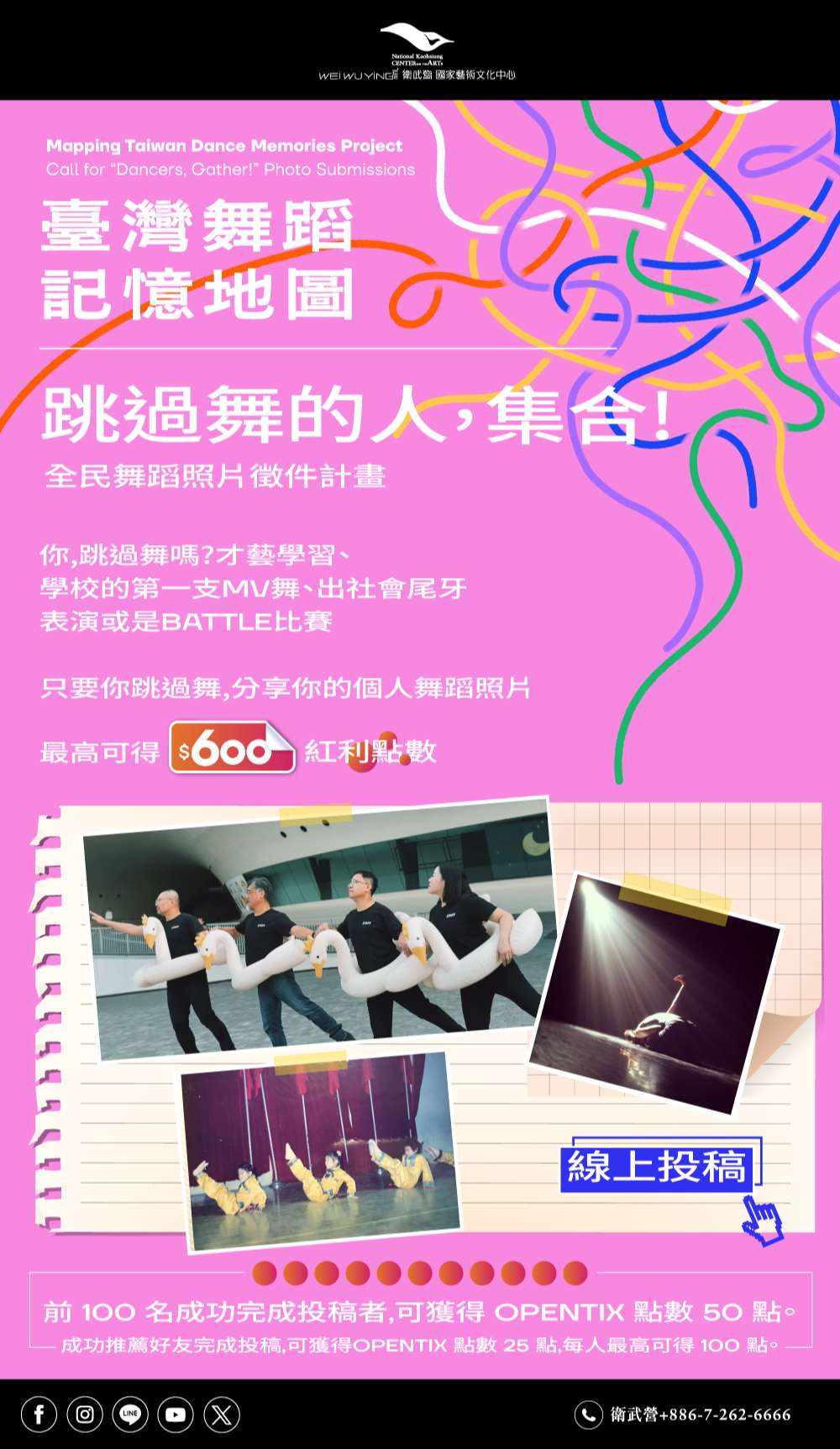 (二)「跳過舞的人,集合!」全民舞蹈照片徵件活動參考簡章或衛武營官網網址: https://npacwwy.tw/en08gMrIj ,邀請師生共同參與投稿,擴大舞蹈記憶之蒐集與交流。