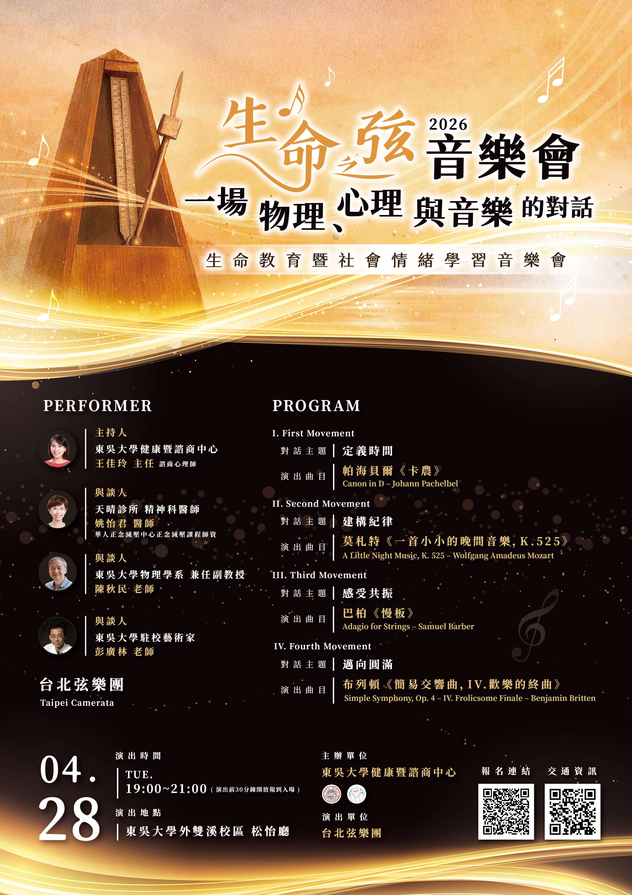 一、為推動生命教育並實踐社會情緒學習(SEL)之精神,本校 謹訂於115年4月28日(星期二)舉辦旨揭音樂會。本次活 動特邀「台北弦樂團」擔綱演出,並透過物理、心理與音 樂之跨領域對話。