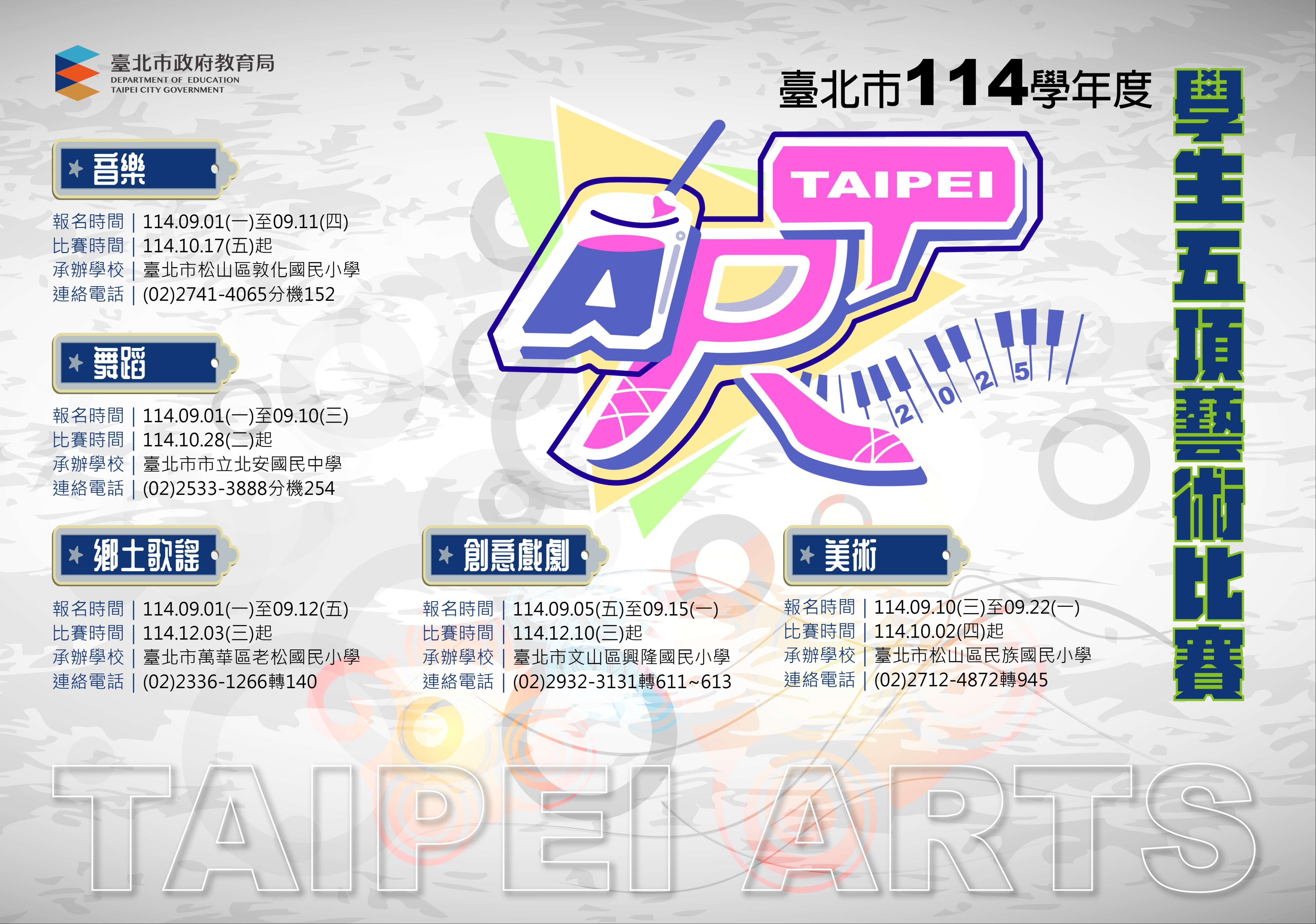 ▲檢附臺北市114學年度學生五項藝術比賽時程表,實施計畫電子檔可至臺北市五項藝術比賽網站