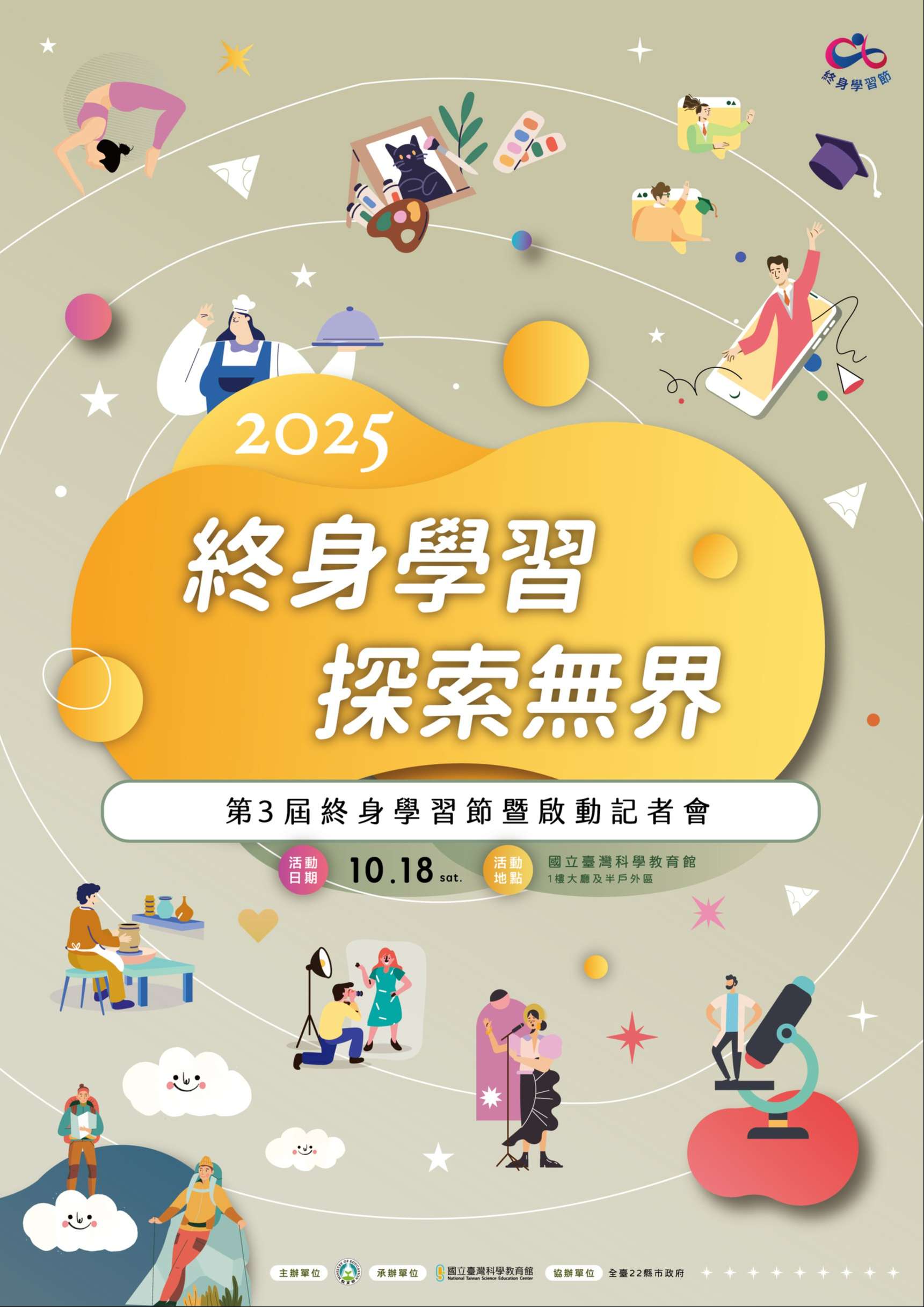 三、本年度活動主題為「終身學習,探索無界」,內容包含啟 動記者會、頒獎表揚、終身學習集章市集與工作坊等多元活動。
