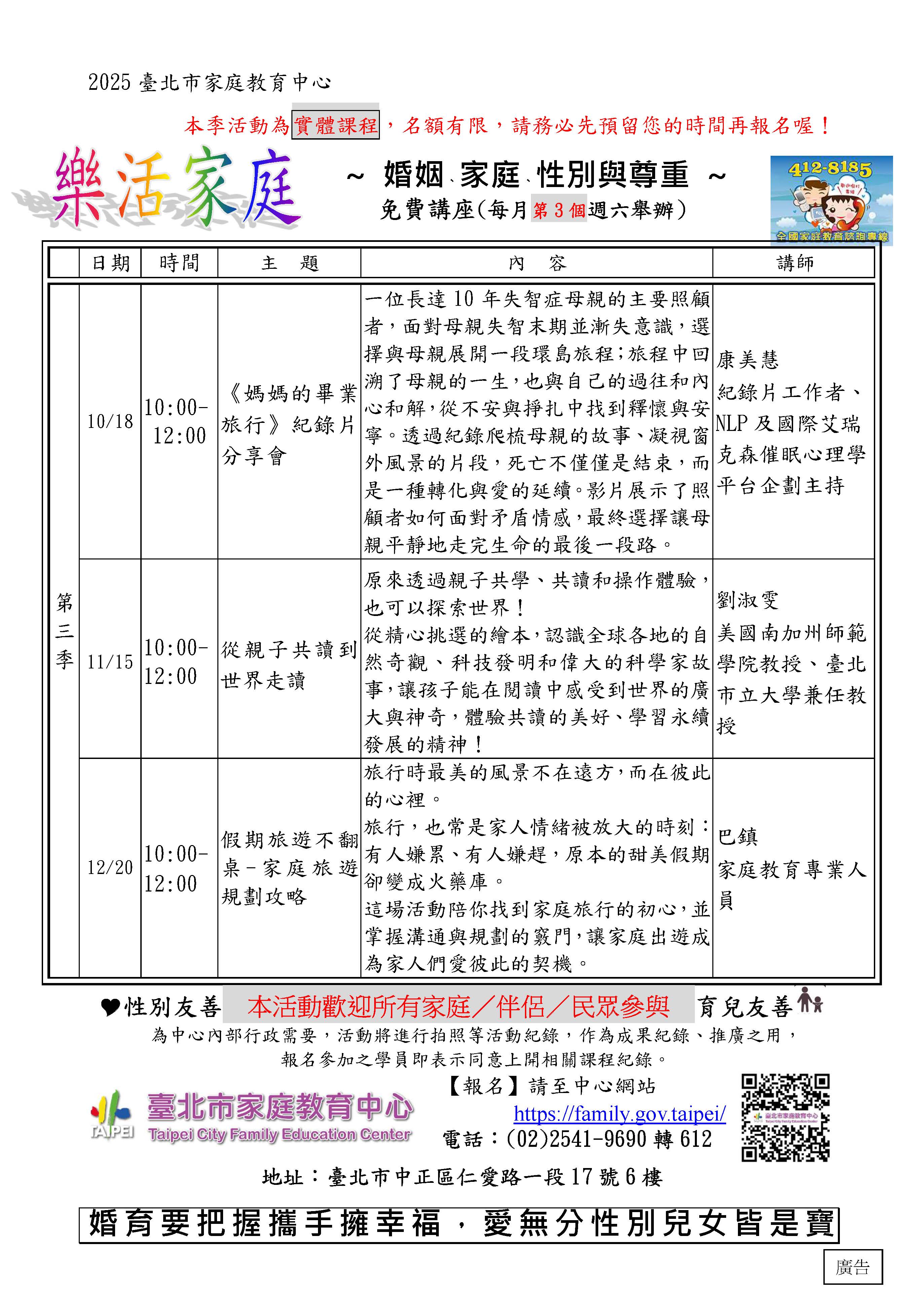 二、活動訊息可於本中心網站(https://family.gov.taipei/)瀏覽、下載。