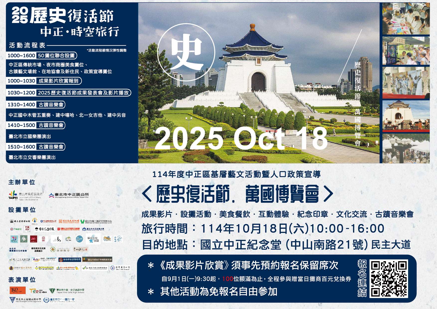 三、臺北市中正區公所將在114年10月18日(星期六)上午10時至下午4時於中正紀念堂前民主大道(中山南路21號),舉辦「2025歷史復活節.萬國博覽會」,展演歷史復活節活動成果,特邀區內票選優勝的傳統市場、夜市商圈美食攤位、各活動合作機關、在地協會及商圈、博物館、古蹟場館等,一起設置50個活動攤位,下午特邀在地音樂社團、市立國樂團及交響樂團,舉辦古蹟音樂會,邀請您一同品文化、玩體驗、拾回憶,感受獨特的中正區地方特色!更多活動詳情,請上