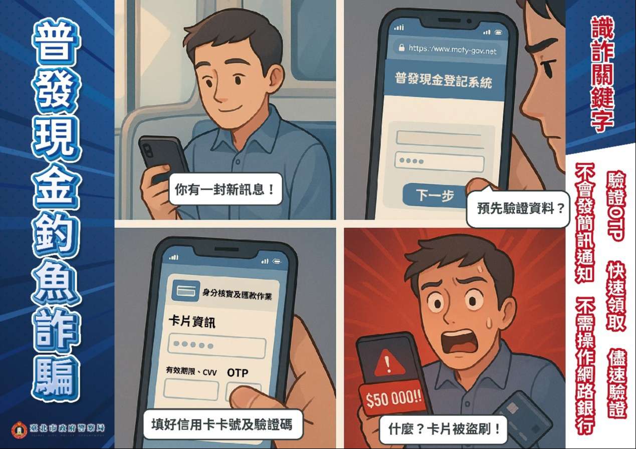 全民普發現金,政府不會發簡訊或電子郵件要求登錄,更不會要求操作ATM或網銀,不點擊、不填輸、不匯款、不轉傳!