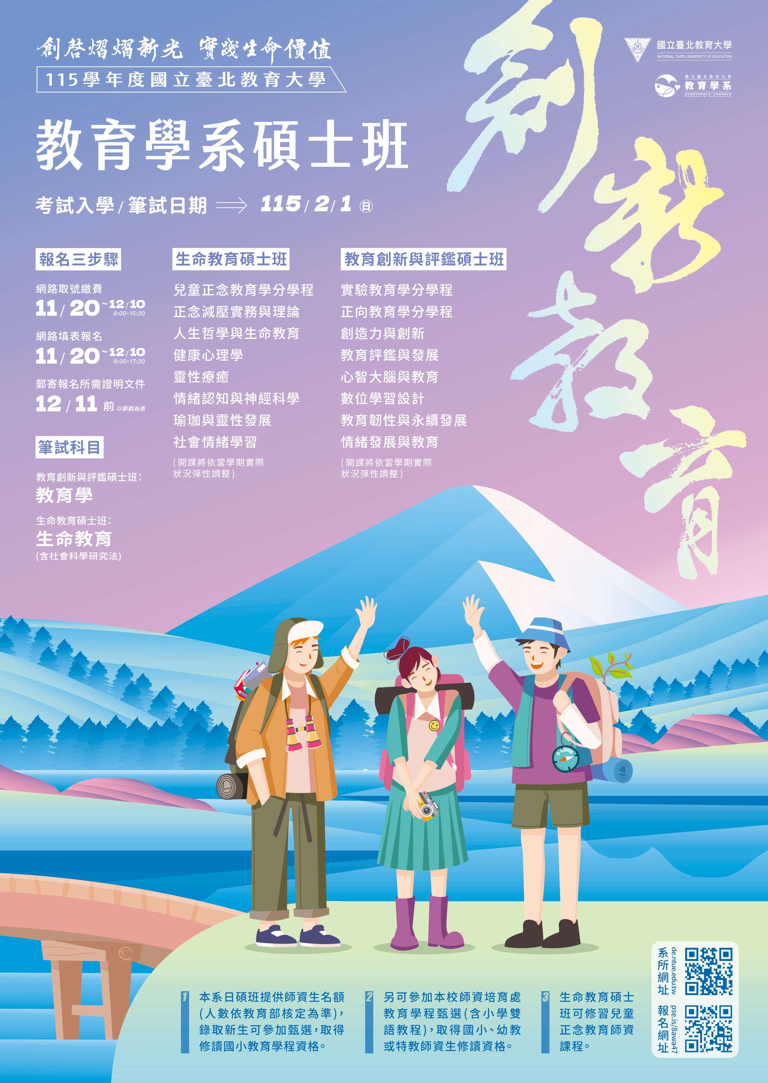 二、碩士班考試入學筆試日期為115年2月1日(日)。教育創 新與評鑑碩士班筆試科目:教育學;生命教育碩士班筆試 科目:生命教育(含社會科學研究法)。