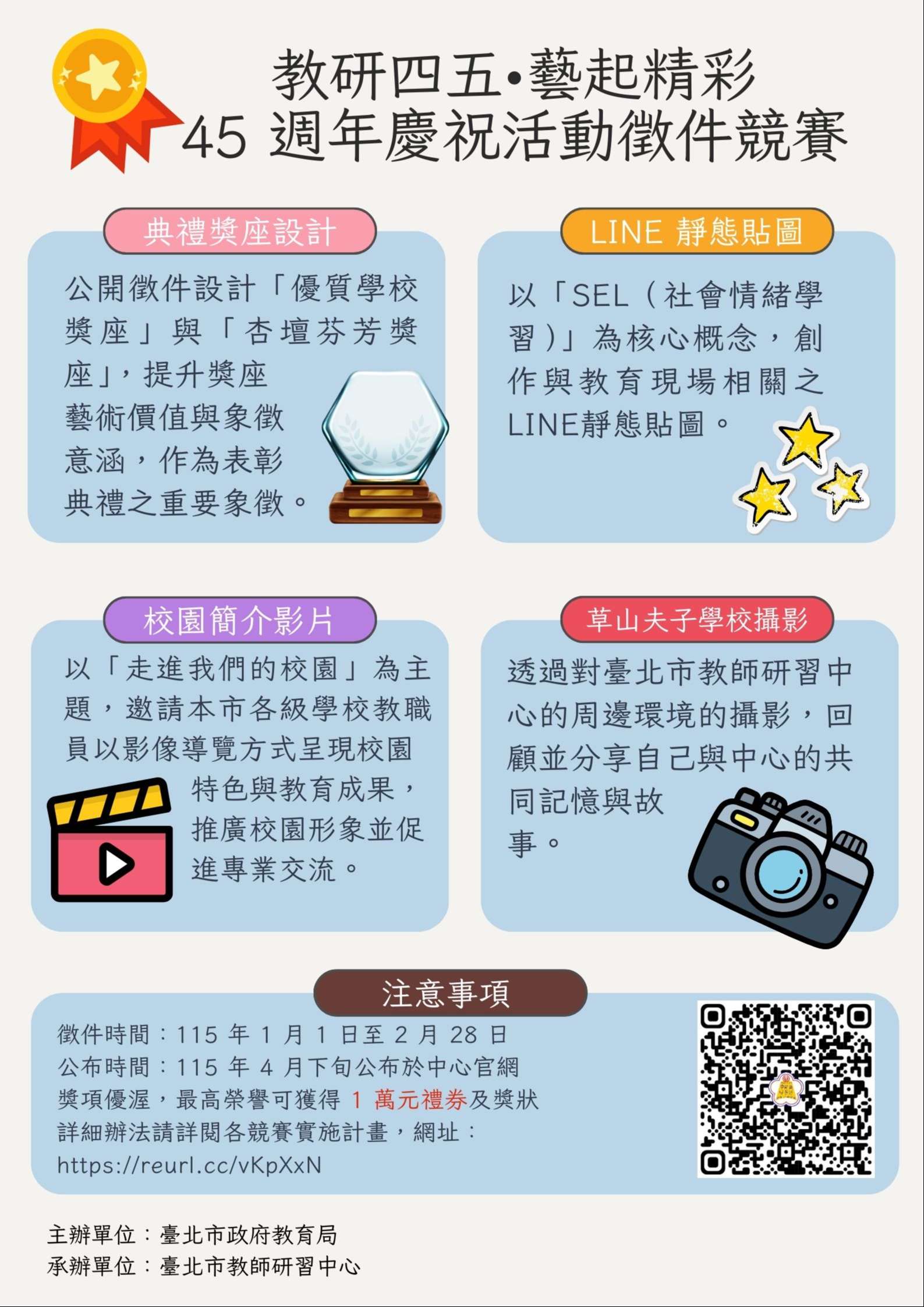 一、臺北市教師研習中心將於明年迎來創立45週年慶。為紀念此一重要里程碑,週年慶系列活動將回顧四十五年來的發展歷程與教育成果,並規劃多元慶祝內容。期盼藉此凝聚教育專業能量,共同開創教育的嶄新未來。配合本中心45週年慶,規劃辦理4項競賽活動,以凝聚教育專業能量並展現創新成果: