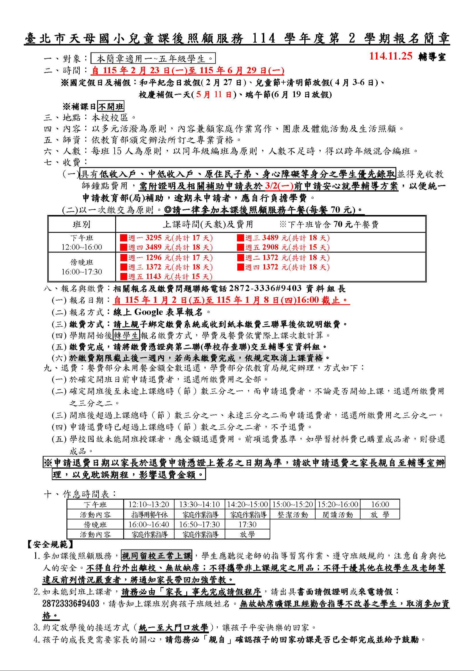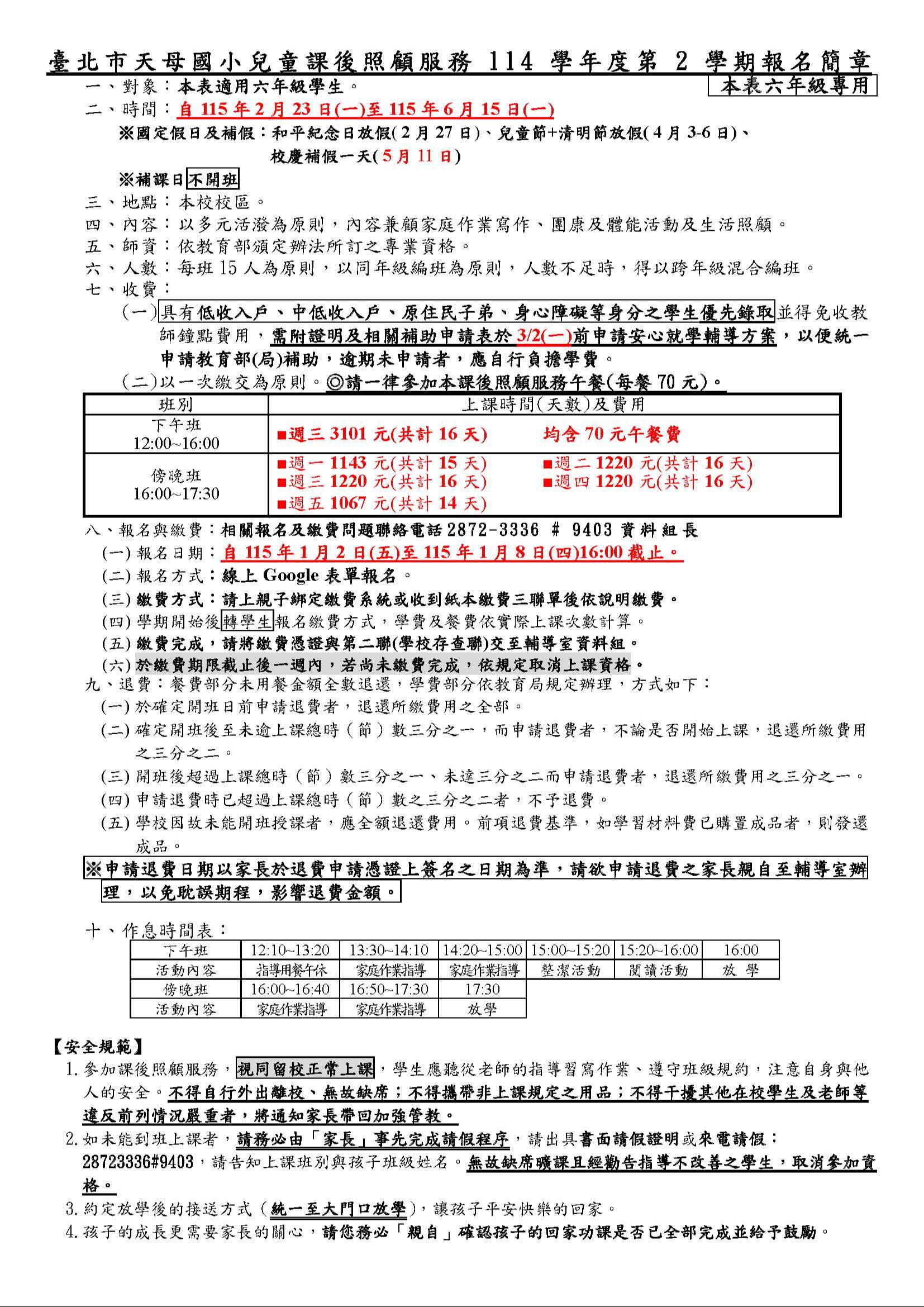 本校114學年度第2學期課後照顧班,自1/2(五)至1/8(四)採線上表單報名,並於本校網頁公布報名網址,以下為報名連結,敬請留意報名期程,逾期不受理。