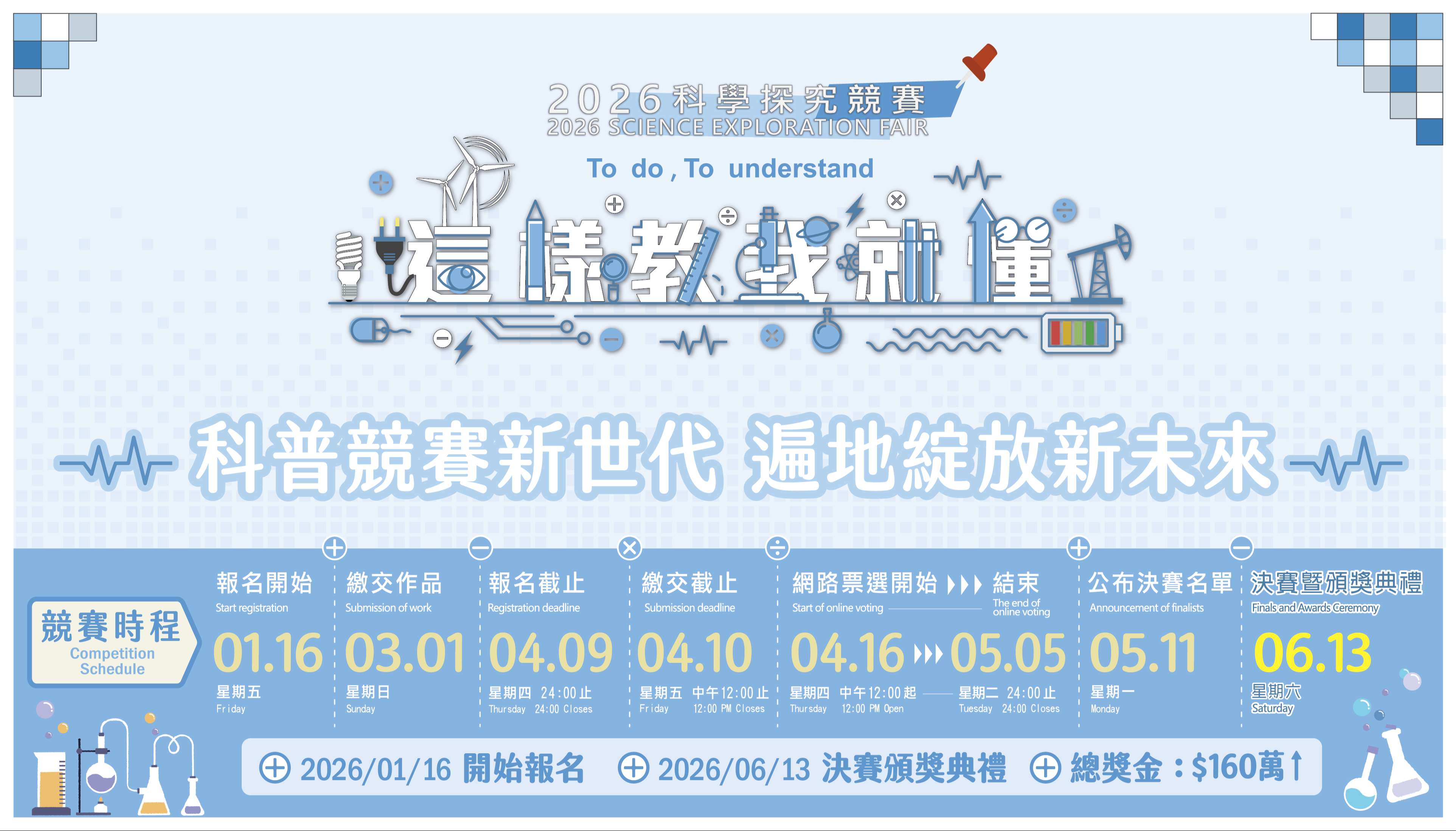 八、報名資訊、競賽方式與獎勵等相關資料請參閱附件或計畫網站(官網:https://sciexplore2026.colife.org.tw;粉絲專頁:https://www.facebook.com/ScitechvistaFair)。相關事宜如有疑義,請逕洽本競賽承辦人陳小姐,(電話:06-5050940分機661、電子信箱: