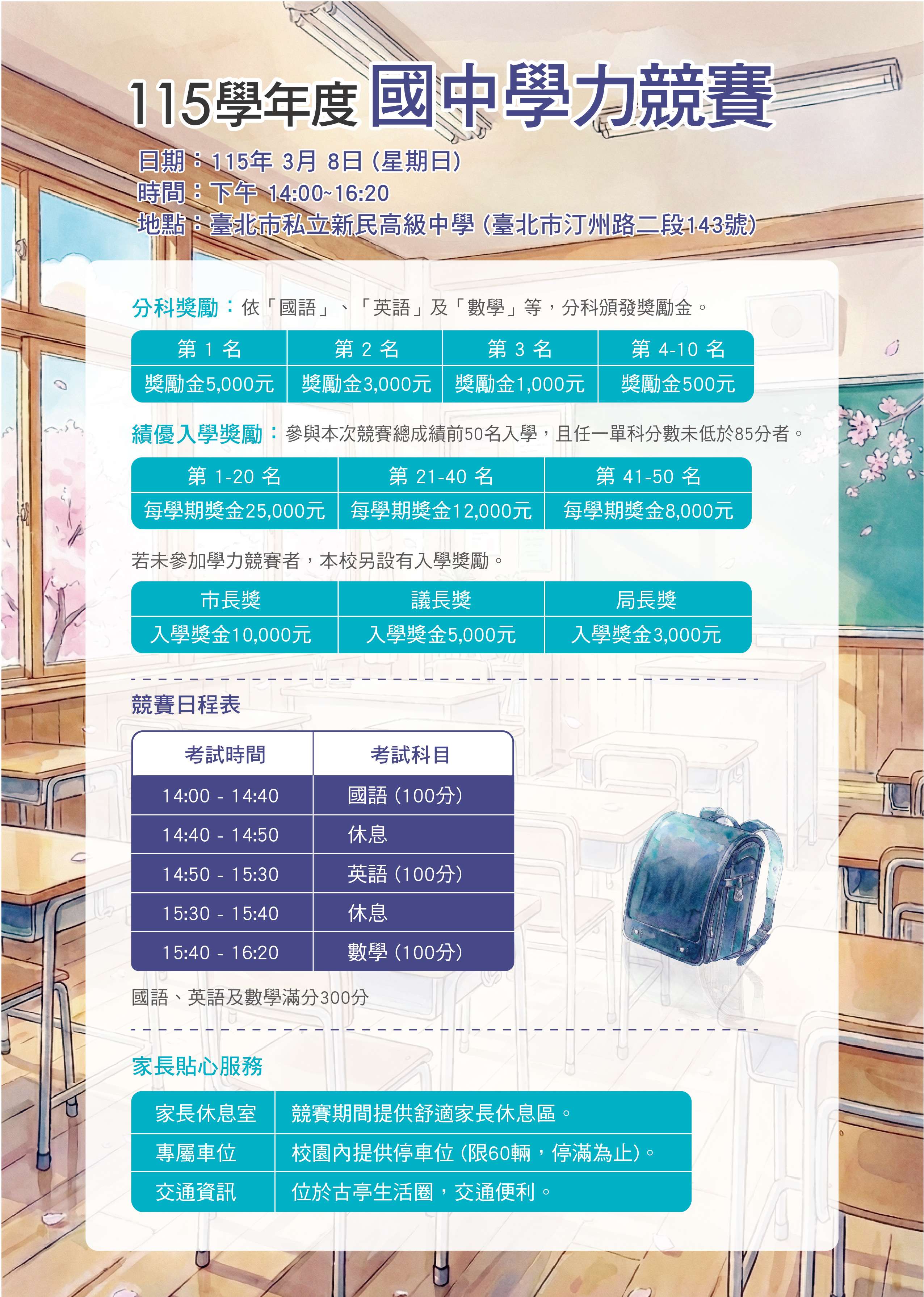 六、當天同步辦理國中入學課程說明會,115年3月8日 (星期日)時間下午14:20~15:20。