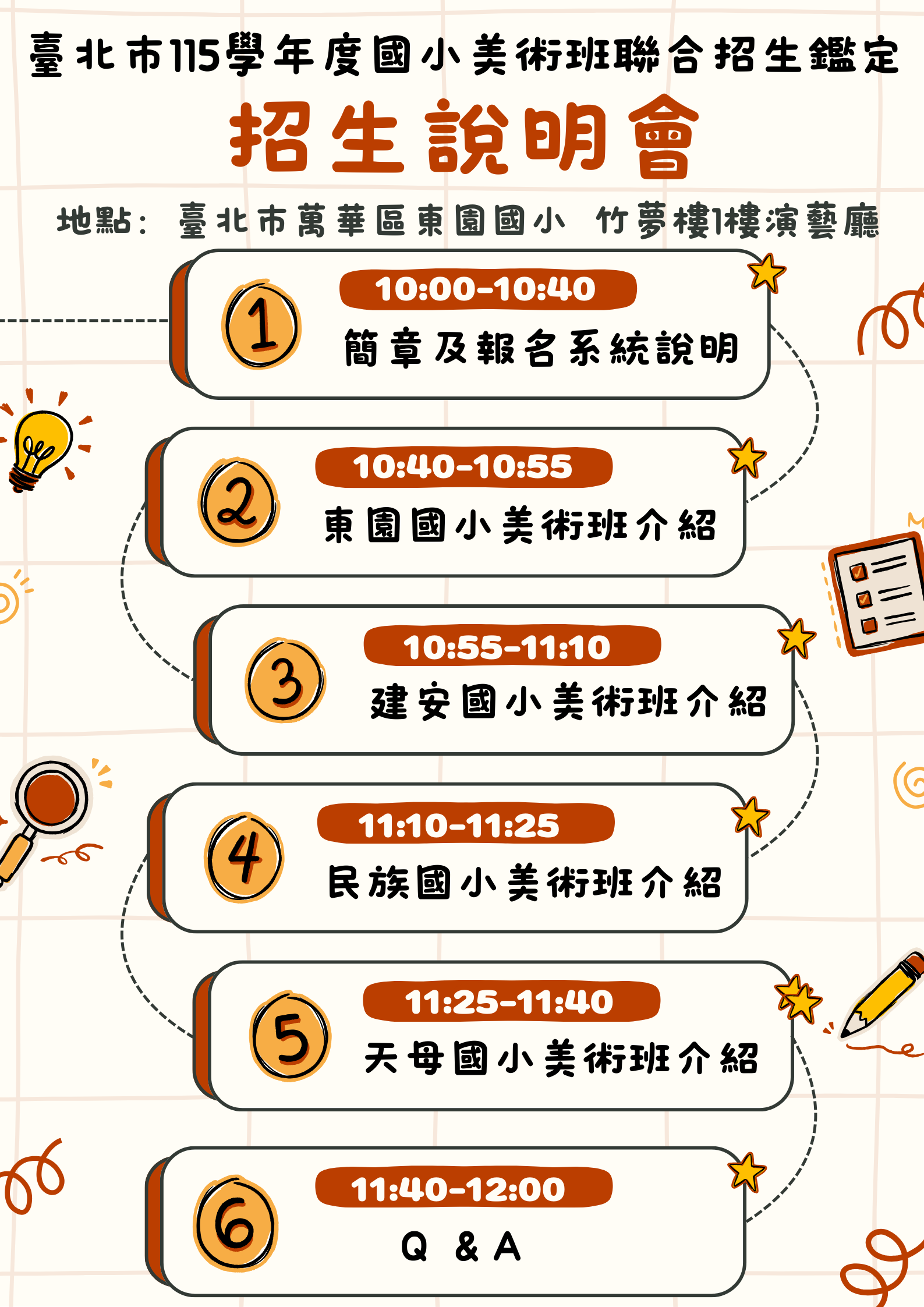 一、本校承辦臺北市115學年度國民小學藝術才能美術班招生鑑 定說明會。