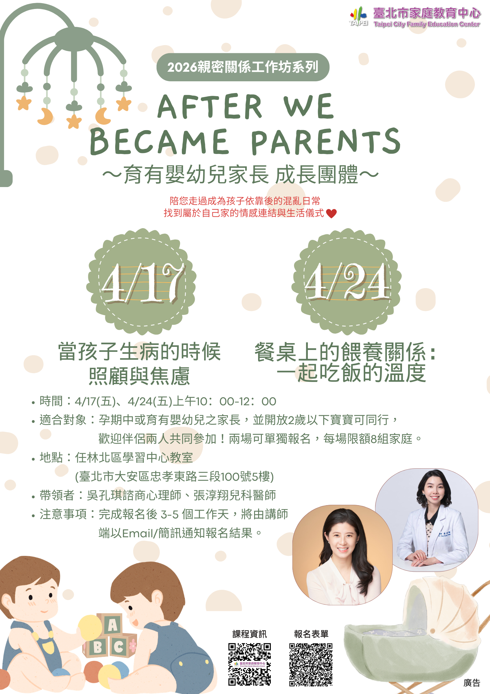 (一)適合對象:孕期中或育有嬰幼兒之家長並開放2歲以下寶寶可同行,歡迎伴侶兩人共同參加,兩場可單獨報名, 每場限額8組家庭。