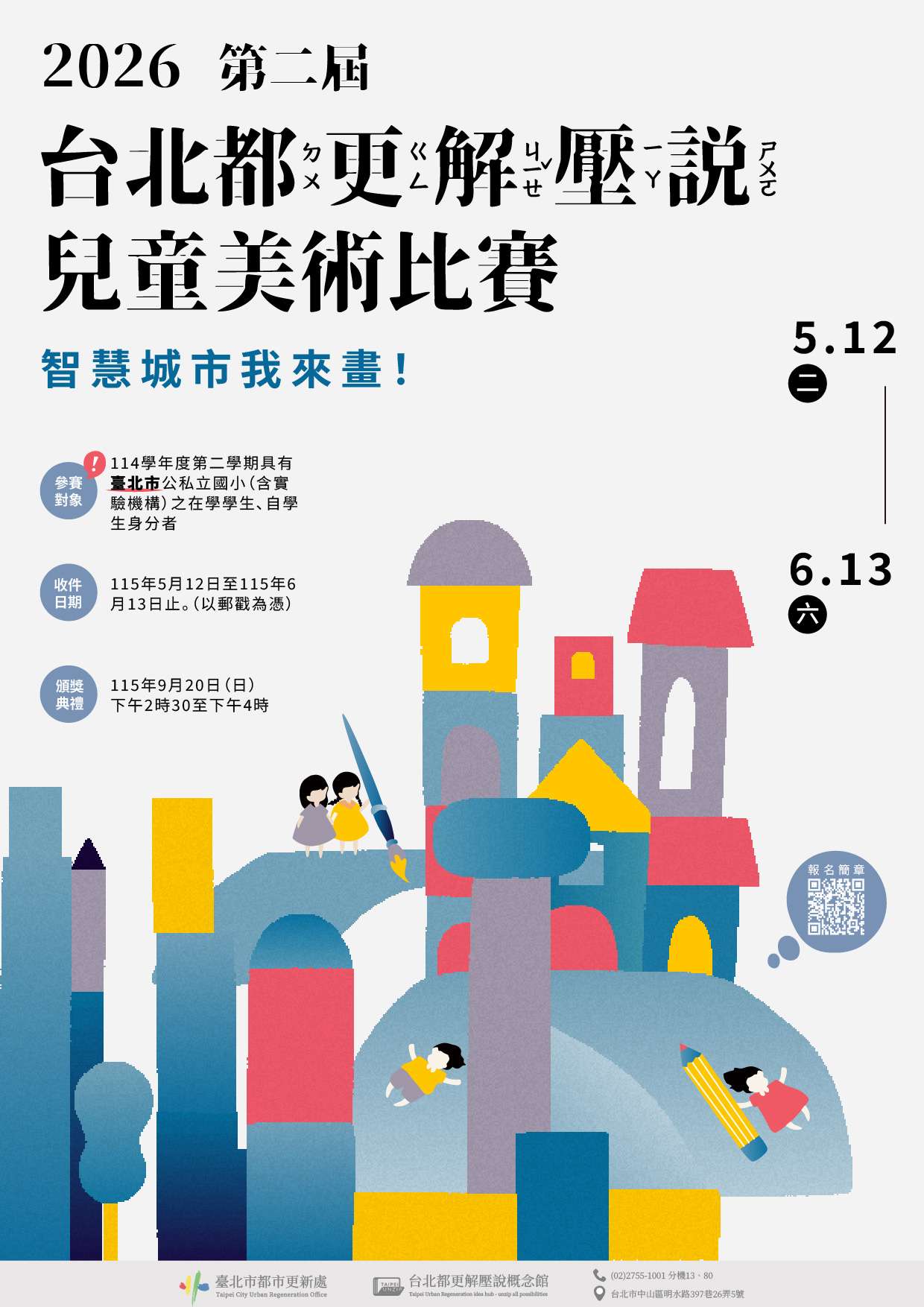 我們誠摯邀請臺北市熱愛畫畫的小朋友,參加「2026第二屆台北都更解壓說兒童美術比賽」!以「智慧城市我來畫!」為主題,畫出你心中智慧城市的模樣。