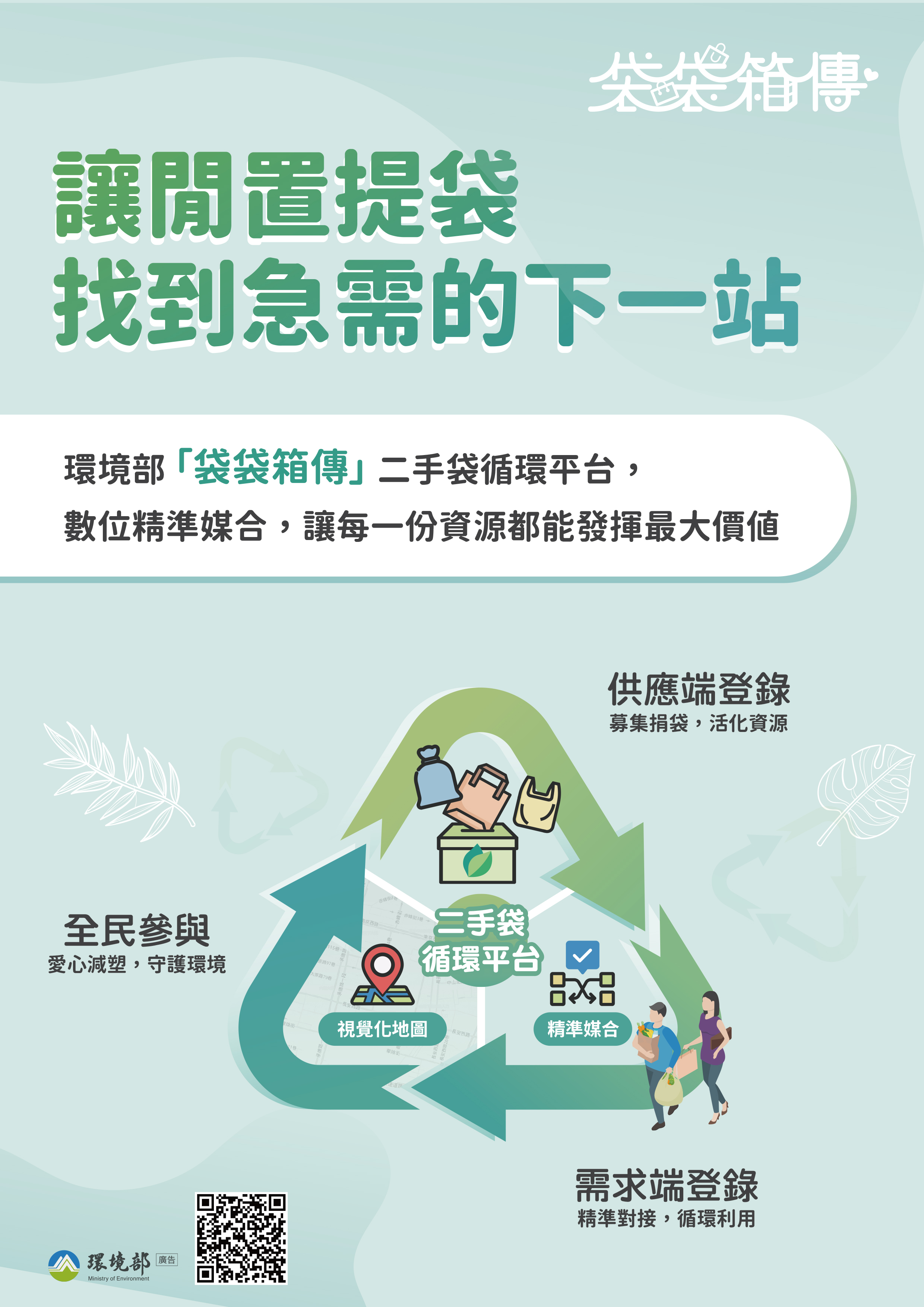 主旨:為提升資源再利用及源頭減量,請各單位協助宣傳環境部 「袋袋箱傳」二手袋循環平台及踴躍響應,推廣二手袋循 環使用與減塑文化,請查照。說明: 一、為因應全球原物料及環境的挑戰,環境部建置「袋袋箱傳」二手袋循環平台(https://sup.moenv.gov.tw/Page /rebag),期公私協力透過該平台連結可提供二手袋的企 業與需要二手袋的商家,讓二手紙袋及購物袋循環流動,實現「減廢、省錢、護地球」的共贏生活圈。二、請貴機關(構)、學校及企業等協助宣傳及踴躍響應,如有大量閒置的二手袋,可至上述平台供應端登錄物資,更可以於合適地點設置二手袋募集箱;市場、商圈、賣場如有二手袋需求,可在平台需求端提出申請,亦可於合適地點設置二手袋取用箱,共同推動減塑行動。