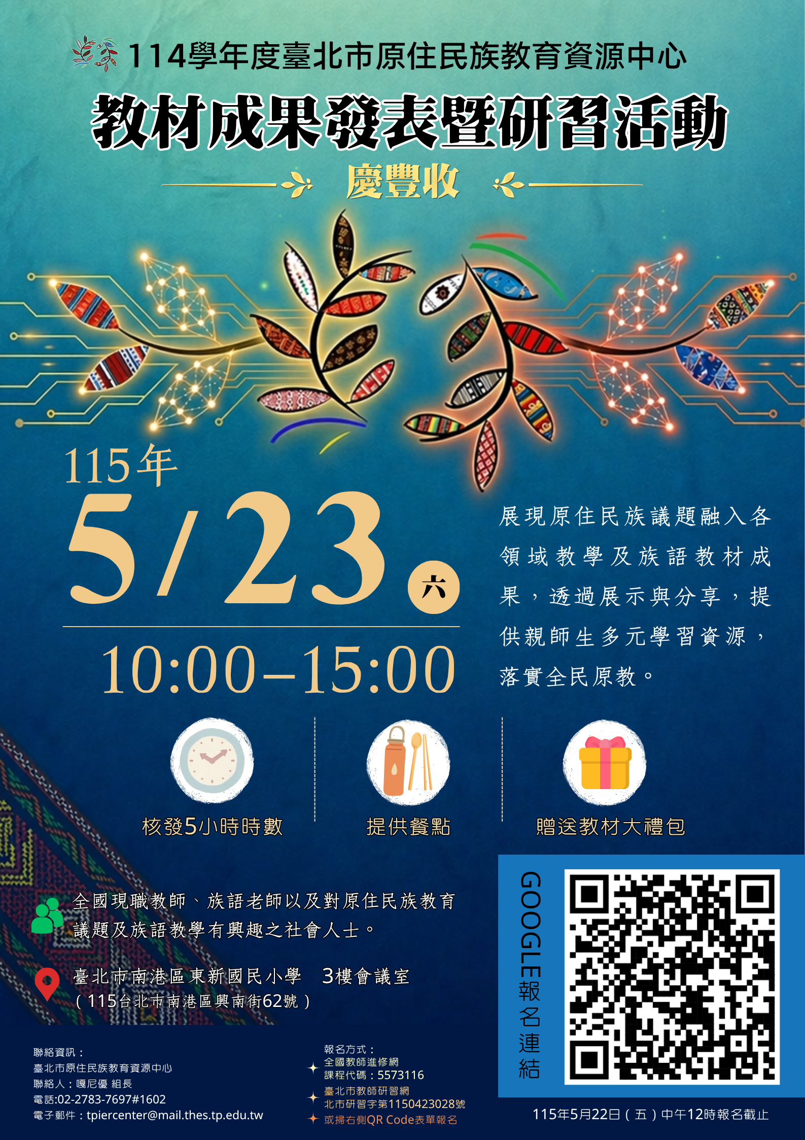 為展現本市原住民族語及議題融入之數位與實體教材研發成果,透過展示與教學分享,提供教師多元備課資源,提 升教材應用與教學效益。 本活動訂於115年5月23日(星期六)上午10時至下午15 時,假臺北市南港區東新國民小學3樓會議室辦理。